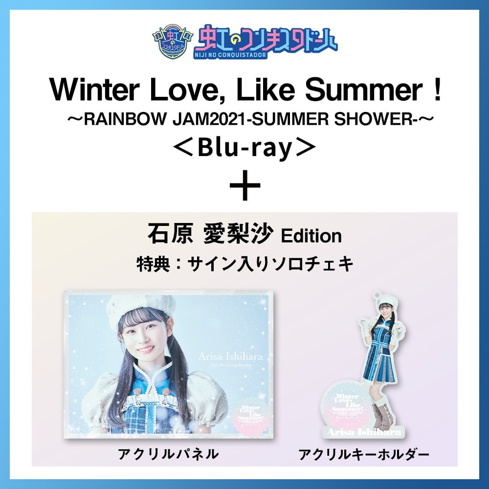「Winter Love, Like Summer!~RAINBOW JAM2021-SUMMER SHOWER-~」と各メンバー別のグッズがセットになったSpecial Limited盤がキンクリ堂限定、期間限定完全受注生産で発売! 【受注期間】 2021年11月1日(月)12時00分(正午)~2021年11月14日(日)23時59分 【商品内容】 [Blu-ray+MAXI] Blu-ray: RAINBOW JAM2021-SUMMER SHOWER- 完全収録 (※2021年8月1日Zepp DiverCityにて行われたワンマンLIVE) MAXI:新曲3曲 収録予定 ※Blu-ray+MAXIは市販品と同内容となります。 [グッズ] ・キンクリ堂限定オリジナルアクリルパネル(石原愛梨沙) ・キンクリ堂限定オリジナルアクリルキーホルダー(石原愛梨沙) [特典] ・サイン入りソロチェキ(石原愛梨沙) ※本商品は完全受注生産商品となります。 ※ご注文受付後のキャンセルはお受けできません。 ※お届けは1月19日を予定しています。 ※Special Limited盤はその他の商品と同時に購入はできません。 ※お支払いはクレジットカード決済、コンビニ決済、PayPayがご利用できます。