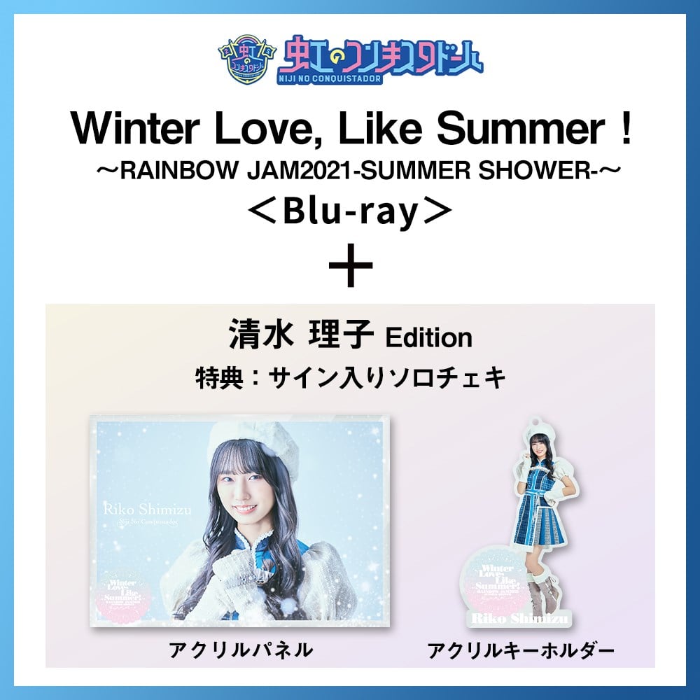 「Winter Love, Like Summer!~RAINBOW JAM2021-SUMMER SHOWER-~」と各メンバー別のグッズがセットになったSpecial Limited盤がキンクリ堂限定、期間限定完全受注生産で発売! 【受注期間】 2021年11月1日(月)12時00分(正午)~2021年11月14日(日)23時59分 【商品内容】 [Blu-ray+MAXI] Blu-ray: RAINBOW JAM2021-SUMMER SHOWER- 完全収録 (※2021年8月1日Zepp DiverCityにて行われたワンマンLIVE) MAXI:新曲3曲 収録予定 ※Blu-ray+MAXIは市販品と同内容となります。 [グッズ] ・キンクリ堂限定オリジナルアクリルパネル(清水理子) ・キンクリ堂限定オリジナルアクリルキーホルダー(清水理子) [特典] ・サイン入りソロチェキ(清水理子) ※本商品は完全受注生産商品となります。 ※ご注文受付後のキャンセルはお受けできません。 ※お届けは1月19日を予定しています。 ※Special Limited盤はその他の商品と同時に購入はできません。 ※お支払いはクレジットカード決済、コンビニ決済、PayPayがご利用できます。