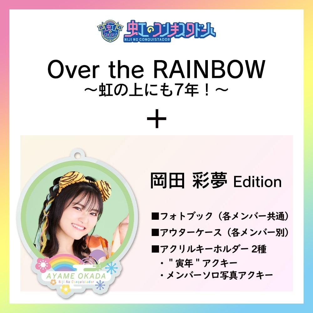 メジャーデビュー以降にリリースした楽曲、Music Videoを全て収録したコンプリートBOXと各メンバー別のグッズがセットになったSpecial Limited盤がキンクリ堂限定、期間限定完全受注生産で発売! ■受注期間 2022年2月4日(金)12時00分(正午)~2022年2月14日(月)23時59分 ■商品内容 「Over the RAINBOW~虹の上にも7年!~」 ・3CD+Blu-ray ※市販品と同内容となります。 ■グッズ ・キンクリ堂限定オリジナル「フォトブック」(各メンバー共通) ・キンクリ堂限定オリジナル「アウターケース」(岡田彩夢) ・キンクリ堂限定オリジナル「アクリルキーホルダー」2種(岡田彩夢) ※本商品は完全受注生産商品となります。 ※ご注文受付後のキャンセルはお受けできません。 ※Special Limited盤はその他の商品と同時に購入はできません。 ※Special Limited盤にはメーカー特典「A4クリアファイル」は付与されません。 ※お支払いはクレジットカード決済、コンビニ決済、PayPayがご利用できます。