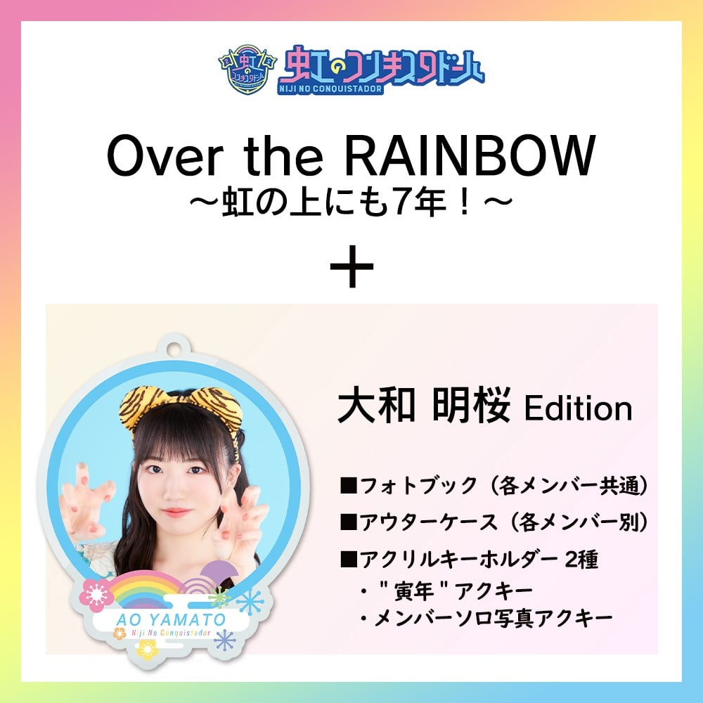 メジャーデビュー以降にリリースした楽曲、Music Videoを全て収録したコンプリートBOXと各メンバー別のグッズがセットになったSpecial Limited盤がキンクリ堂限定、期間限定完全受注生産で発売! ■受注期間 2022年2月4日(金)12時00分(正午)~2022年2月14日(月)23時59分 ■商品内容 「Over the RAINBOW~虹の上にも7年!~」 ・3CD+Blu-ray ※市販品と同内容となります。 ■グッズ ・キンクリ堂限定オリジナル「フォトブック」(各メンバー共通) ・キンクリ堂限定オリジナル「アウターケース」(大和明桜) ・キンクリ堂限定オリジナル「アクリルキーホルダー」2種(大和明桜) ※本商品は完全受注生産商品となります。 ※ご注文受付後のキャンセルはお受けできません。 ※Special Limited盤はその他の商品と同時に購入はできません。 ※Special Limited盤にはメーカー特典「A4クリアファイル」は付与されません。 ※お支払いはクレジットカード決済、コンビニ決済、PayPayがご利用できます。