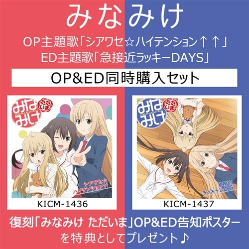 復刻「みなみけ ただいま」OP・EDの同時購入セットになります! 対象期間:2017年10月31日(火)~ 無くなり次第終了 ※みなみけ ただいま オープニングテーマ「シアワセ☆ハイテンション↑↑」&みなみけ ただいま エンディングテーマ「急接近ラッキーDAYS」 ※こちらの商品は11月1日(水)以降のお届けとなりますのご了承ください。 先着で2作同時購入の方に"復刻「みなみけ ただいま」OP&ED告知ポスター"をプレゼント! ■2作同時購入特典 復刻「みなみけ ただいま」OP&ED告知ポスター※2作同時購入特典「復刻告知ポスター」は、単品での購入には付与されませんのでご注意ください。 ※特典には数に限りがあり、予定数量に達し次第特典付きでの販売は終了致します。