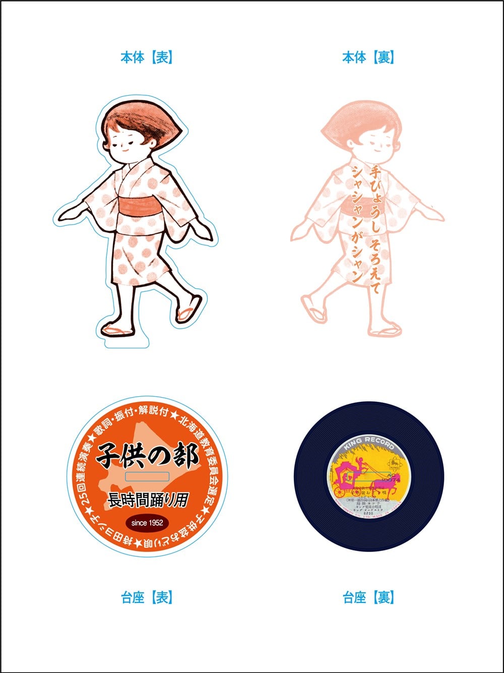 子供盆おどり唄」リバーシブルアクリルスタンド。 台座【表】は「子供の部」「長時間踊り用」など本曲の重要キーワードを配したオリジナルデザイン。 台座【裏】は伝説の初代SPレコード(1952年)を再現しました。 どちらで飾ってもヨシ! 一緒に記念撮影するもヨシ! 素材:アクリル サイズ:本体高さ 約85㎜/台座直径 約55㎜ 日本製 *台座がリバーシブル仕様のため、抜き差しを繰り返すと差込口が緩くなりますのでご注意ください。 *画像は制作途中のものとなりますので、実際の商品とは異なる場合がございます。