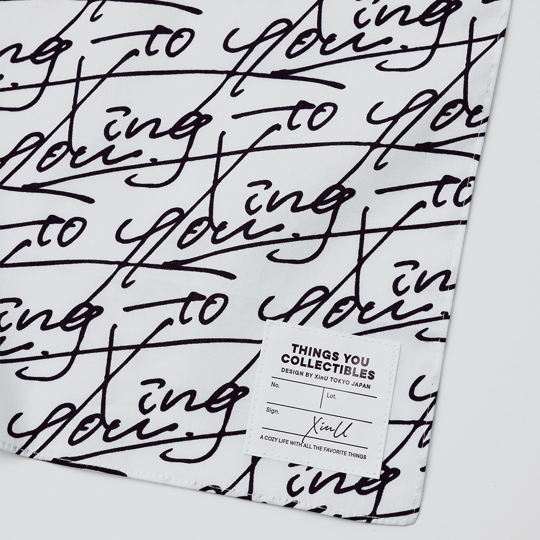 XinUのデビュー期を象徴するエモーショナルな手書きメッセージロゴ「Xing to you」 今回、そのメッセージを新たにデザインに落とし込み構築したグラフィックパターンへと再定義した。クリーンなホワイトのキャンバスに、大胆なブラックスクリプトが縦横無尽に交差するデザイン。 余計なカラーを排除したモノトーンのコントラストが、メッセージの持つ力強さと、アイテムの持つモードなシャープさを引き立てます。 このスカーフは、あなたの日常にさりげなくアートをインストールする着用可能なシグネチャー。 首元に結んでメッセージを主張するアクセサリーとして。または、額装してプライベートな空間を彩るウォールアートとして。 生活に寄り添い、あなたの感情が向かうままに、自由に、そして大切に使ってください。 【サイズ・カラー・スペック】 素材:綿100% サイズ:W520×H520mm ※商品の画像は実際の色味やデザインと異なる場合がございます。あらかじめご了承ください。 「THINGS YOU COLLECTIBLES」