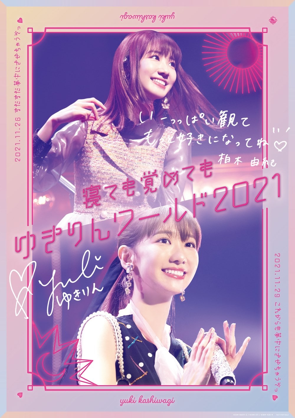 形態:DVD2枚組 [収録内容] ①柏木由紀「寝ても覚めてもゆきりんワールド~まだまだ夢中にさせちゃうぞっ~♡」@パシフィコ横浜 国立大ホール(2021.11.26) ②柏木由紀「寝ても覚めてもゆきりんワールド~これからも夢中にさせちゃうぞっ~♡」@神奈川県民ホール 大ホール(2021.11.29) 収録曲: ①柏木由紀 寝ても覚めてもゆきりんワールド ~まだまだ夢中にさせちゃうぞっ♡~ 2021.11.26 パシフィコ横浜 国立大ホール 1.CAN YOU WALK WITH ME?? 2.カッコ悪い I love you! 3.遠距離ポスター 4.ハート型ウイルス 5.Blue rose 6.だらしない愛し方 7.BINGO! 8.初日 9.フライングゲット 10.てもでもの涙 11.口移しのチョコレート 12.夜風の仕業 13.あなたと私 14.ショートケーキ 15.そっけない君 16.沈黙 17.柏木由紀なりのBiSH -BAD TEMPER- 18.Why don’t you?? 19.彼女になれますか? 20.ジェラシーパンチ 21.呼び捨てファンタジー 22.君のことが好きだから En1.シアターの女神 En2.You and I En3.火山灰 ②柏木由紀 寝ても覚めてもゆきりんワールド ~これからも夢中にさせちゃうぞっ♡~ 2021.11.29 神奈川県民ホール 大ホール 1.CAN YOU WALK WITH ME?? 2.カッコ悪い I love you! 3.遠距離ポスター 4.ハート型ウイルス 5.Blue rose 6.だらしない愛し方 7.BINGO! 8.初日 9.フライングゲット 10.てもでもの涙 11.口移しのチョコレート 12.夜風の仕業 13.あなたと私 14.Birthday wedding 15.Green Flash 16.沈黙 17.柏木由紀なりのBiSH -BAD TEMPER- 18.Why don’t you?? 19.彼女になれますか? 20.ジェラシーパンチ 21.呼び捨てファンタジー 22.君のことが好きだから En1.シアターの女神 En2.You and I En3.火山灰