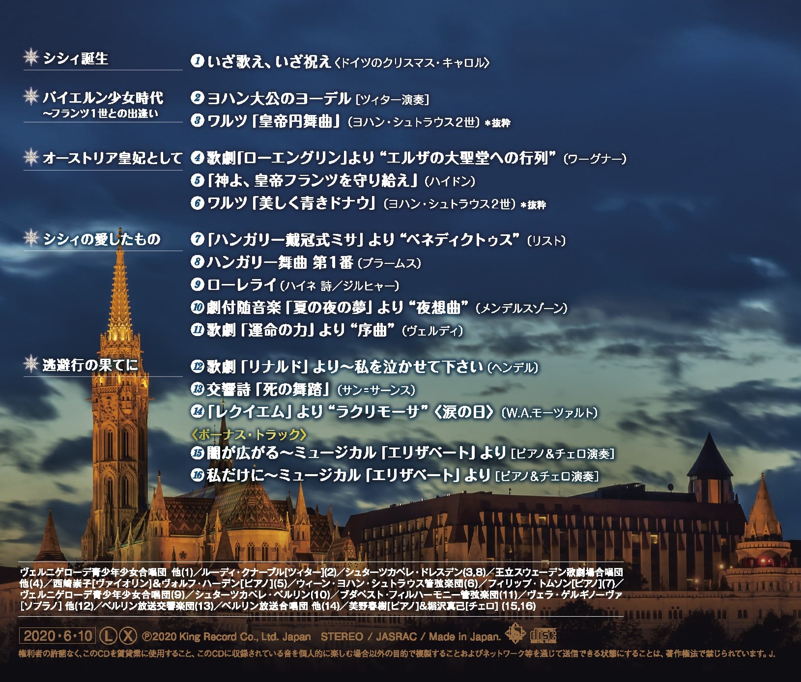流浪の皇妃エリザベートが生きた時代の音楽を、その生涯に重ねて選曲。 シシィが聴いたかもしれない、ロマン溢れる音楽アルバム。 ボーナス・トラックにミュージカル「エリザベート」の人気ナンバーをピアノ&チェロの美しい演奏で収録!(楽曲解説:高坂はる香) <収録曲> ■シシィ誕生 01 いざ歌え、いざ祝え〈ドイツのクリスマス・キャロル〉 ■バイエルン少女時代~フランツ1世との出逢い 02 ヨハン大公のヨーデル[ツィター演奏] 03 ワルツ「皇帝円舞曲」(ヨハン・シュトラウス2世) *抜粋 ■オーストリア皇妃として 04 歌劇「ローエングリン」より“エルザの大聖堂への行列”(ワーグナー) 05 神よ、皇帝フランツを守り給え (ハイドン) 06 ワルツ「美しく青きドナウ」 (ヨハン・シュトラウ2世) *抜粋 ■シシィの愛したもの 07 「ハンガリー戴冠式ミサ」より "ベネディクトゥス" (リスト) 08 ハンガリー舞曲 第1番(ブラームス) 09 ローレライ(ハイネ 詩/ジルヒャー) 10 劇付随音楽「夏の夜の夢」より“夜想曲”(メンデルスゾーン) 11 歌劇「運命の力」より"序曲" (ヴェルディ) ■逃避行の果てに 12 歌劇「リナルド」より~私を泣かせて下さい(ヘンデル) 13 交響詩「死の舞踏」" (サン=サーンス) 14 「レクイエム」より“ラクリモーサ〈涙の日〉" (W.A.モーツァルト) ★ボーナス・トラック 15 闇が広がる~ミュージカル「エリザベート」より[ピアノ&チェロ演奏] 16 私だけに~ミュージカル「エリザベート」より[ピアノ&チェロ演奏] =================================== ヴェルニゲローデ青少年少女合唱団 他(1)/ルーディ・クナーブル[ツィター](2)/シュターツカペレ・ドレスデン(3,8)/王立スウェーデン歌劇場合唱団 他(4)/西崎崇子[ヴァイオリン]&ヴォルフ・ハーデン[ピアノ](5)/ウィーン・ヨハン・シュトラウス管弦楽団(6)/フィリップ・トムソン[ピアノ](7)/ ヴェルニゲローデ青少年少女合唱団(9)/シュターツカペレ・ベルリン(10)/ブダペスト・フィルハーモニー管弦楽団(11)/ヴェラ・ゲルギノーヴァ [ ソプラノ]他(12)/ベルリン放送交響楽団(13)/ベルリン放送合唱団 他(14)/美野春樹[ピアノ]&堀沢真己[チェロ] (15,16)
