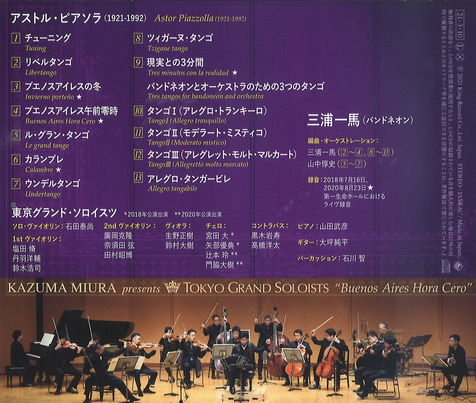 ●2017年に三浦一馬が自ら立ち上げ、毎年満場一致の客席を大いに沸かせている 「東京グランド・ソロイスツ」シリーズ、待望のライブ盤。 ●NHK2021年大河ドラマ「青天を衝け」の毎週エンディングで放送される 【大河紀行】の音楽の演奏も担当し、近年注目がより集まっております。 ●ピアノ生誕100年に向けて、更に磨きがかかるクールで熱い男たちのピアソラをご堪 能ください。