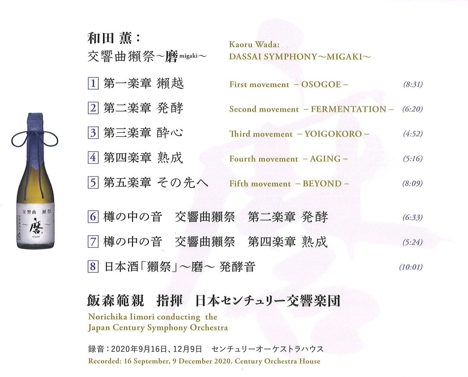 ●酒造りのためにお酒に聴かせるための交響曲をつくり、 演奏を聴かせながら醸造させたお酒はどうなるのか!?前代未聞のプロジェクト。 このプロジェクトのために生まれた交響曲がこの獺祭交響曲~磨~です。 ●作曲は伊福部昭の愛弟子、「犬夜叉」「半妖の夜叉姫」「金田一少年の事件簿」で人気の和田薫氏。 壮大、重厚でリズミカルなオーケストラ曲に仕上がっています。 演奏は、この前代未聞のプロジェクトを立ち上げた日本センチュリー交響楽団。 指揮は、当団首席指揮者の飯森範親。 【試聴映像】2/24発売「和田 薫:交響曲獺祭~磨 migaki」飯森範親指揮 日本センチュリー交響楽団