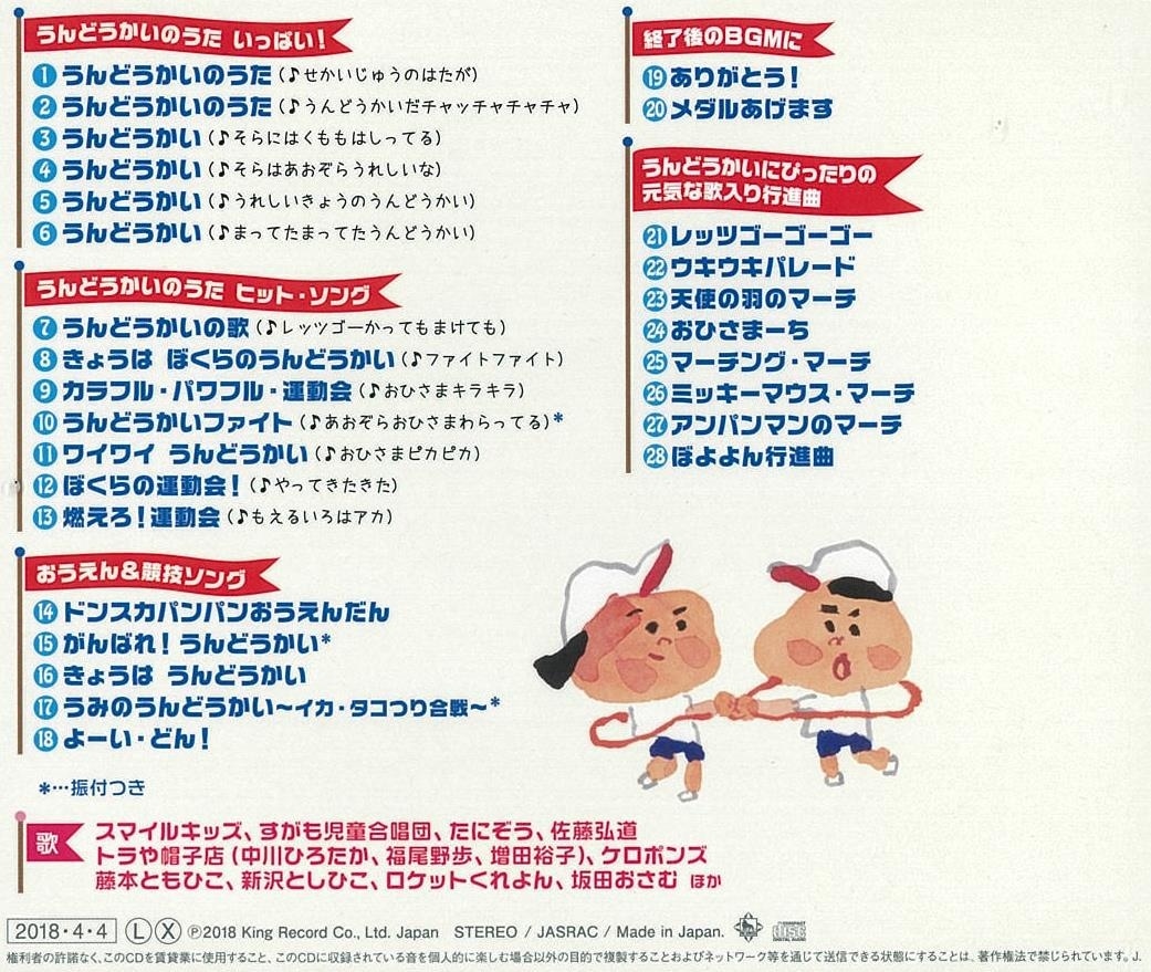◆保育CD初かも?!1万人が見た「運動会の歌」。実は楽譜集には多数載っているけれど、CD化されていない歌もたくさん。 本CDにはそんな初CD化の歌も収録した貴重なアルバム。 《Hoickシリーズ》月刊25万人が訪れる保育界のビッグ・サイト〈Hoick〉とのコラボ企画。 閲覧数10000人以上の殿堂入り保育ソング 【収録曲】 ◇うんどうかいのうた いっぱい! 01.うんどうかいのうた(せかいじゅうの はたが) 02.うんどうかいのうた(うんどうかいだチャッチャチャチャ) 03.うんどうかい(そらにはくももはしってる) 04.うんどうかい(そらはあおぞらうれしいな) 05.うんどうかい(うれしいきょうのうんどうかい) 06.うんどうかい(まってたまってたうんどうかい) ◇うんどうかいのうた ヒット・ソング 07.うんどうかいの歌(レッツゴーかってもまけても) 08.きょうは ぼくらのうんどうかい(ファイトファイト) 09.カラフル・パワフル・運動会(おひさまキラキラ) 10.うんどうかいファイト (あおぞらおひさまわらってる) * 11.ワイワイうんどうかい(おひさまピカピカ) 12.ぼくらの運動会!(やってきたきた) 13.燃えろ!運動会 (もえるいろはアカ) ◇おうえん&競技ソング 14.ドンスカパンパンおうえんだん 15.がんばれ!うんどうかい * 16.きょうは うんどうかい 17.うみのうんどうかい~イカ・タコつり合戦~ * 18.よーい・どん! ◇終了後のBGMに 19.ありがとう! 20.メダルあげます ◇うんどうかいにぴったりの元気な歌入り行進曲 21.レッツゴーゴーゴー 22.ウキウキパレード 23.天使の羽のマーチ 24.おひさまーち 25.マーチング・マーチ 26.ミッキーマウス・マーチ 27.アンパンマンのマーチ 28.ぼよよん行進曲 *振付つき 歌:たにぞう、佐藤弘道、ロケットくれよん、スマイルキッズ、すがも児童合唱団、 トラや帽子店(中川ひろたか、福尾野歩、増田裕子)、ケロポンズ、藤本ともひこ、 新沢としひこ、ロケットくれよん、坂田おさむ ほか 保育情報サイト「Hoick」は、こちらをクリック!