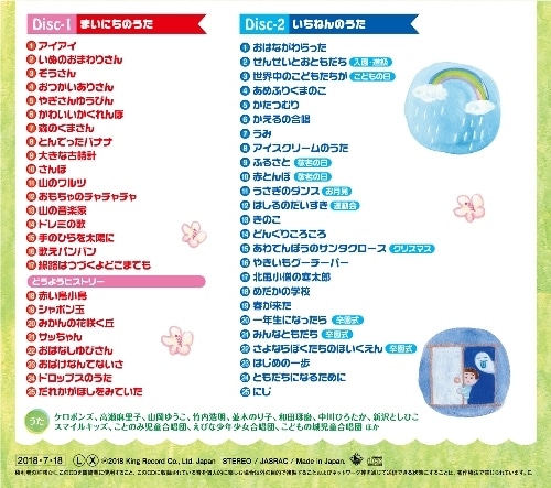 長年保育ソングを通して子どもたちと関わってきた、保育界をリードする4人(四天王!) 中川ひろたか・新沢としひこ・ケロポンズ(増田裕子・平田明子)が、子どもたちや保育者に向けて、 歌いたい、伝えたい童謡を50曲厳選しました! ◆特集◆ LINE LIVEでの童謡への想いや楽しいトークをぎゅ~っとまとめてブックレットに収録。 ◆特典◆ 4人で歌った「にじ」の動画が見れます!(詳細はブックレットにて) <DISC1> ●まいにちのうた 1.アイアイ 2.いぬのおまわりさん 3.ぞうさん 4.おつかいありさん(ケロポンズ歌唱) 5.やぎさんゆうびん 6.かわいいかくれんぼ(ケロポンズ歌唱) 7.森のくまさん 8.とんでったバナナ 9.大きな古時計 10.さんぽ 11.山のワルツ 12.おもちゃのチャチャチャ 13.山の音楽家(ケロポンズ歌唱) 14.ドレミの歌 15.手のひらを太陽に 16.歌えバンバン 17.線路はつづくよどこまでも 《どうようヒストリー》 18.赤い鳥小鳥 19.シャボン玉 20.みかんの花咲く丘 21.サッちゃん 24.おはなしゆびさん 22.おばけなんてないさ(ケロポンズ歌唱) 23.ドロップスのうた 25.だれかがほしをみていた <DISC2> ●いちねんのうた 1.おはながわらった 2.せんせいとおともだち〈入園・進級〉 3.世界中のこどもたちが〈こどもの日〉 4.あめふりくまのこ 5.かたつむり 6.かえるの合唱 7.うみ 8.アイスクリームのうた 9.ふるさと〈敬老の日〉 10.赤とんぼ〈敬老の日〉 11.うさぎのダンス〈お月見〉(ケロポンズ歌唱) 12.はしるのだいすき〈運動会〉 13.きのこ 14.どんぐりころころ 15.あわてんぼうのサンタクロース〈クリスマス〉 16.やきいもグーチーパー 17.北風小僧の寒太郎 18.めだかの学校 19.春が来た 20.一年生になったら〈卒園式〉 21みんなともだち〈卒園式〉 22.さよならぼくたちのほいくえん〈卒園式〉 23.はじめの一歩 24.ともだちになるために 25.にじ with中川ひろたか&新沢としひこ 歌:ケロポンズ、高瀬麻里子、山岡ゆうこ、竹内浩明、並木のり子、和田琢磨、 中川ひろたか、新沢としひこ、スマイルキッズ、ことのみ児童合唱団、えびな少年少女合唱団 ほか