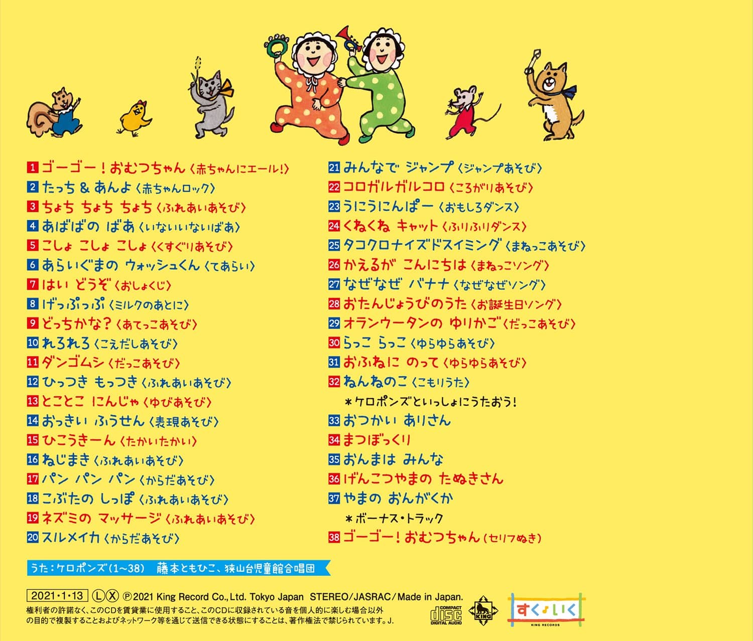 保育界のスーパーユニット、ケロポンズの最新作 キュートで楽しい、ふれい赤ちゃん遊びのアルバム<0・1・2歳児向け> ●遊び方解説つき <収録曲> 01.ゴーゴー!おむつちゃん<赤ちゃんにエール!> 02.たっち & あんよ <赤ちゃんロック> 03.ちょち ちょち ちょち <ふれあいあそび> 04.あばばの ばあ <いないいないばぁ> 05.こしょ こしょ こしょ <くすぐりあそび> 06.あらいぐまの ウォッシュくん <てあらい> 07.はい どうぞ <おしょくじ> 08.げっぷっぷ <ミルクのあとに> 09.どっちかな? <あてっこあそび> 10.れろれろ <こえだしあそび> 11.ダンゴムシ <だっこあそび> 12.ひっつき もっつき <ふれあいあそび> 13.とことこ にんじゃ <ゆびあそび> 14.おっきい ふうせん <表現あそび> 15.ひこうきーん <たかいたかい> 16.ねじまき <ふれあいあそび> 17.パン パン パン <からだあそび> 18.こぶたの しっぽ <ふれあいあそび> 19.ネズミの マッサージ <ふれあいあそび> 20.スルメイカ <からだあそび> 21.みんなで ジャンプ <ジャンプあそび> 22.コロガルガルコロ <ころがりあそび> 23.うにうにんぱー <おもしろダンス> 24.くねくね キャット <ふりふりダンス> 25.タコクロナイズドスイミング <まねっこあそび> 26.かえるが こんにちは<まねっこソング> 27.なぜなぜ バナナ<なぜなぜソング> 28.おたんじょうびのうた <お誕生日ソング> 29.オランウータンの ゆりかご <だっこあそび> 30.らっこ らっこ <ゆらゆらあそび> 31.おふねに のって <ゆらゆらあそび> 32.ねんねのこ <こもりうた> ●ケロポンズといっしょにうたおう! 33.おつかい ありさん 34.まつぼっくり 35.おんまは みんな 36.げんこつやまの たぬきさん 37.やまの おんがくか ●ボーナス・トラック 38.ゴーゴー!おむつちゃん(セリフぬき) うた:ケロポンズ(1~38)藤本ともひこ、狭山第二児童館合唱団 ほか ◆ケロポンズ(増田裕子・平田明子) 子どもだけでなく大人も一緒に楽しめる、歌あり、笑いあり、あそびあり、体操あり、 なんでもあり~のステージの面白さが 宇宙的!と 評判の女性2人組ユニット「ケロポンズ」の、 赤ちゃんとママパパが楽しめる赤ちゃんあそびアルバム。 ゆかいな遊び歌やほっこり笑顔になれる遊びなど、 ケロポンズの魅力がつまった37曲+1のフルボリュームでお届けします!