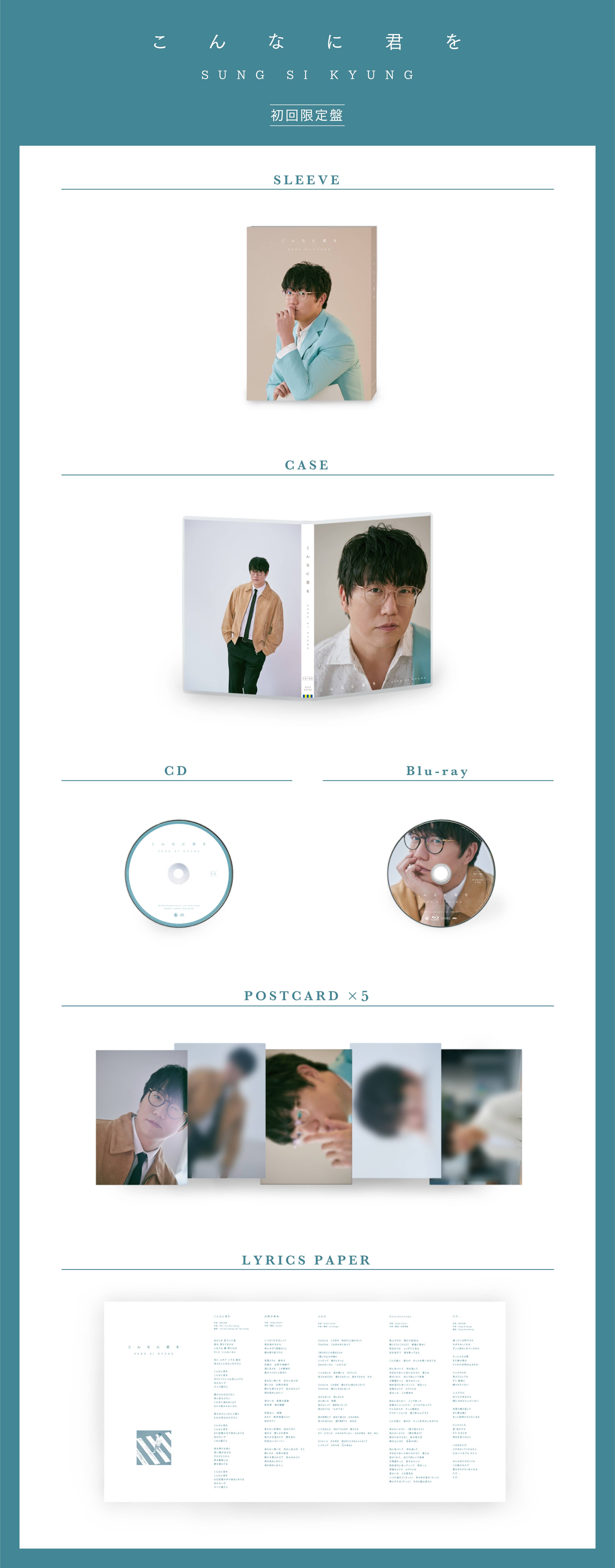 バラード歌手、シンガー・ソングライターとして、第一線で活躍し続けるソン・シギョン。2017年の日本デビューから現在に至るまで、さまざまな愛のカタチを日本語の歌にのせて届続けています。 キングレコード移籍第1作となる本アルバムは、「江南スタイル」で世界中を熱狂させたPSY作曲、松井五郎作詩による珠玉のバラード「こんなに君を」をリード曲として収録!本人作曲による「ただ…」を含む、全曲オリジナル楽曲で構成します。 初回限定盤は、トールケースに封入特典としてポストカードセットが封入される他、初の試みとして撮りおろしのライヴ映像を収録。韓国で国民的大ヒットとなった韓国ドラマ「シークレット・ガーデン」OSTの「君は僕の春」の他、日本活動楽曲でのスペシャルメドレー、アルバム収録楽曲から「こんなに君を」を収録予定。 【CD収録内容】 1. こんなに君を (作詩:松井五郎/作曲:PSY, Yoo Gun Hyung/編曲:Yoo Gun Hyung, Go Tae Young) 2. 沈黙の音色 (作詩:Soflan Daichi/作曲・編曲:Ziyoon) 3. ふれる (作詩:Soflan Daichi/作曲・編曲:Jo Dongik) 4. Kaleidoscope (作詩:Soflan Daichi/作曲・編曲:松尾昌樹) 5. ただ... (作詩:松井五郎/作曲:Sung Si Kyung/編曲:Kang Hwa Seong) 6. 束の間でも僕たち Feat. Naul <잠시라도 우리> (作詩:Park Joo Yeon/作曲:Naul/編曲:Kang Hwa Seong) 【Blu-ray収録内容】 撮りおろしスペシャルライヴ&トーク映像収録 ①君は僕の春[너는 나의 봄이다](ノヌン ナエ ボミダ) 韓国ドラマ『シークレット・ガーデン』OSTより ②オリジナルメドレー ③こんなに君を ■特別仕様:スリーブつきトールケース入り ポストカードセット(5枚)を封入