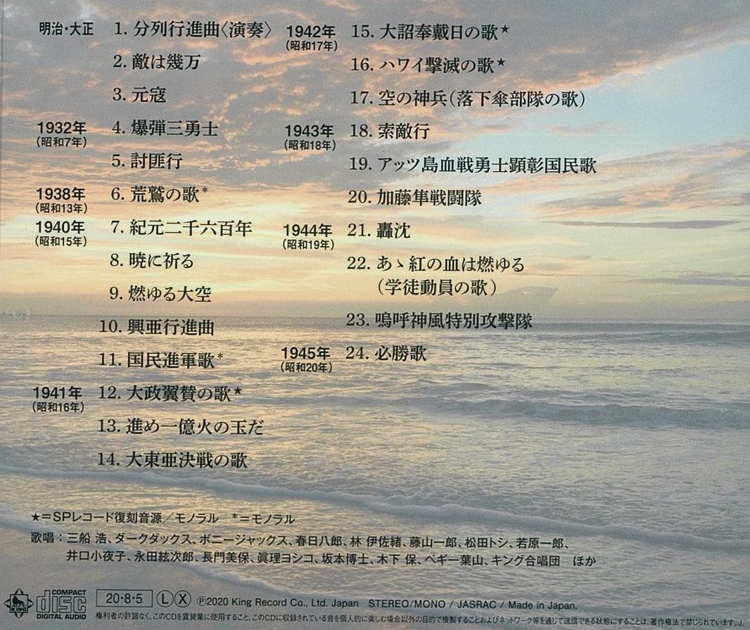 戦局の中で生まれた歌を時代に沿って聞くことで戦時下の 日本を感じる24曲。 <収録曲目> ~明治・大正~ 01. 分列行進曲〈演奏〉 02. 敵は幾万 03. 元寇 ~1932(昭和 7)年~ 04. 爆弾三勇士 05. 討匪行 ~1938(昭和15)年~ 06. 荒鷲の歌* ~1940(昭和13)年~ 07. 紀元二千六百年 08. 暁に祈る 09. 燃ゆる大空 10. 興亜行進曲 11. 国民進軍歌 ~1941(昭和16)年~ 12. 大政翼賛の歌 ★ 13. 進め一億火の玉だ 14. 大東亜決戦の歌 ~1942(昭和17)年~ 15. 大詔奉戴日の歌 ★ 16. ハワイ撃滅の歌 ★ 17. 空の神兵(落下傘部隊の歌) ~1943(昭和18)年~ 18. 索敵行 19. アッツ島血戦勇士顕彰国民歌 ~1944(昭和19)年~ 20. 加藤隼戦闘隊 21. 轟沈 22. ああ紅の血は燃ゆる(学徒動員の歌)- 23. 嗚呼神風特別攻撃隊 ~1945(昭和20)年~ 24. 必勝歌 ★印…SPレコード復刻音源/モノラル 歌唱:三船 浩、ダークダックス、ボニージャックス、春日八郎、林 伊佐緒、藤山一郎、 松田トシ、若原一郎、井口小夜子、永田絃次郎、長門美保、眞理ヨシコ、木下 保、 ペギー葉山、キング合唱団 ほか