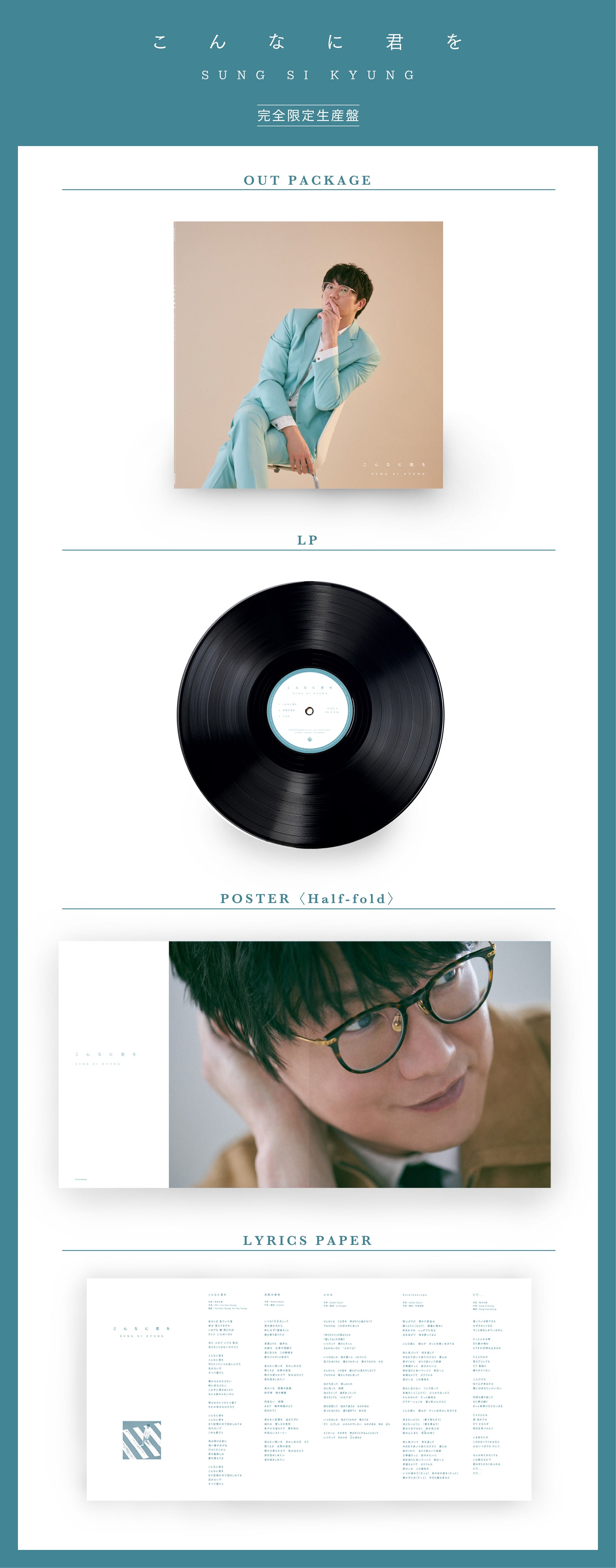 バラード歌手、シンガー・ソングライターとして、第一線で活躍し続けるソン・シギョン。2017年の日本デビューから現在に至るまで、さまざまな愛のカタチを日本語の歌にのせて届続けています。 キングレコード移籍第1作となる本アルバムは、「江南スタイル」で世界中を熱狂させたPSY作曲、松井五郎作詩による珠玉のバラード「こんなに君を」をリード曲として収録!本人作曲による「ただ…」を含む、全曲オリジナル楽曲で構成します。 本作は日本アルバムとしては初のLP盤となります。 【収録内容】 1. こんなに君を (作詩:松井五郎/作曲:PSY, Yoo Gun Hyung/編曲:Yoo Gun Hyung, Go Tae Young) 2. 沈黙の音色 (作詩:Soflan Daichi/作曲・編曲:Ziyoon) 3. ふれる (作詩:Soflan Daichi/作曲・編曲:Jo Dongik) 4. Kaleidoscope (作詩:Soflan Daichi/作曲・編曲:松尾昌樹) 5. ただ... (作詩:松井五郎/作曲:Sung Si Kyung/編曲:Kang Hwa Seong) 6. 束の間でも僕たち Feat. Naul <잠시라도 우리> (作詩:Park Joo Yeon/作曲:Naul/編曲:Kang Hwa Seong)
