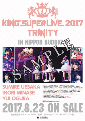 [パッケージ仕様] トールケース・(初回製造分のみ)三方背BOX付 [出演] 上坂すみれ、小倉 唯、水瀬いのり [収録内容] KING SUPER LIVE 2017 TRINITY 2017年3月5日 東京・日本武道館公演を完全収録! 1.Inner Urge/上坂すみれ 2.閻魔大王に訊いてごらん/上坂すみれ 3.♡をつければかわいかろう/上坂すみれ 4.恋する図形(cubic futurismo) /上坂すみれ 5.文豪でGO!/上坂すみれ 6.七つの海よりキミの海/上坂すみれ 7.夢のつぼみ/水瀬いのり 8.MELODY FLAG/水瀬いのり 9.Starry Wish/水瀬いのり 10.Ring of Smile/水瀬いのり 11.春空/水瀬いのり 12.harmony ribbon/水瀬いのり 13.Honey♥Come!!/小倉 唯 14.Baby Sweet Berry Love/小倉 唯 15.Future Strike/小倉 唯 16.Raise/小倉 唯 17.ガーリッシュエイジ/小倉 唯 18.ハイタッチ☆メモリー/小倉 唯 19.STARTING NOW!/上坂すみれ×水瀬いのり 20.Love Destiny/小倉 唯×上坂すみれ 21.ETERNAL BLAZE/水瀬いのり×小倉 唯 22.経験値上昇中☆/上坂すみれ×小倉 唯×水瀬いのり EN.ハッピー☆マテリアル/上坂すみれ×小倉 唯×水瀬いのり [映像特典] メイキング映像