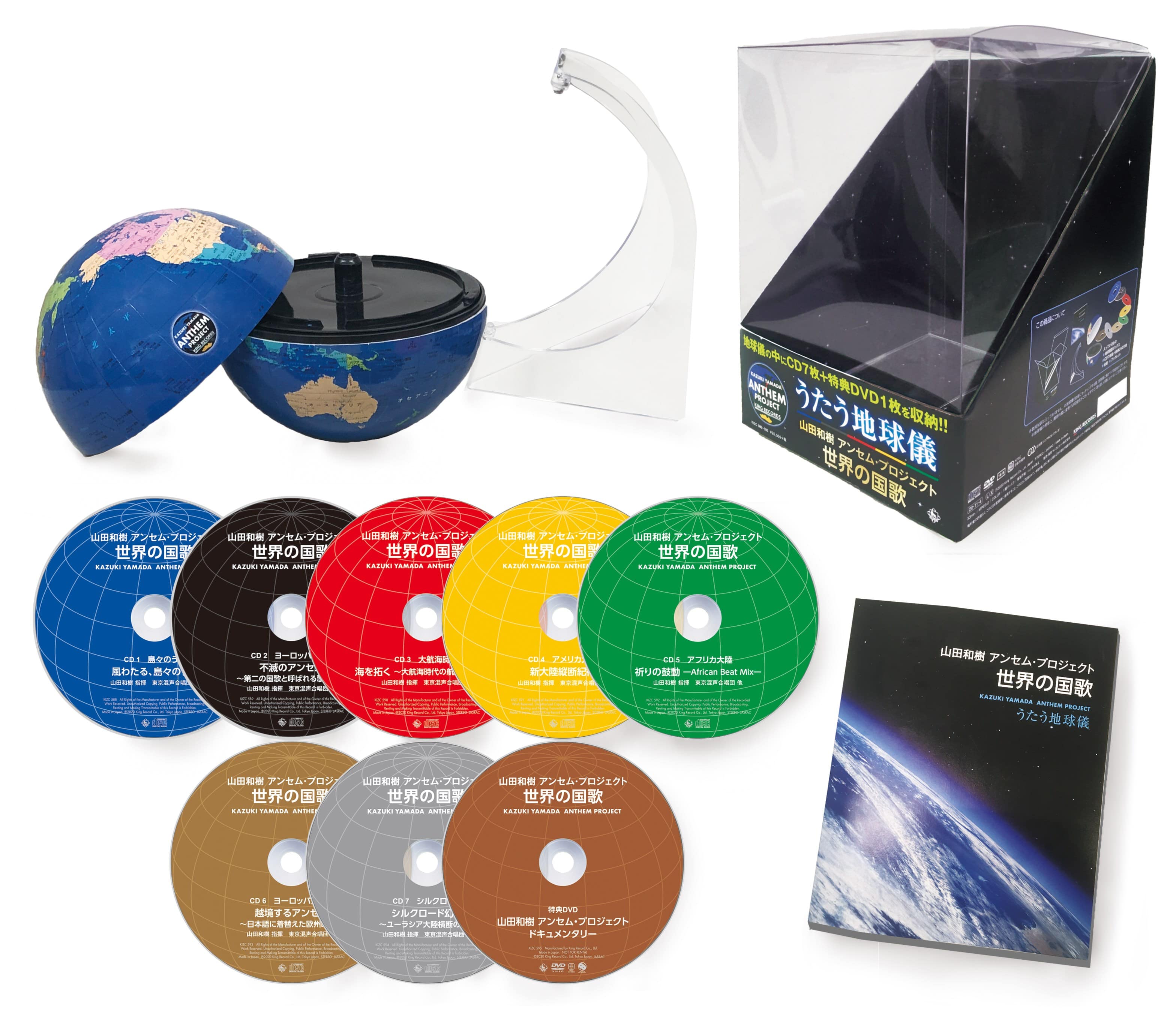 *写真はイメージ画像です。 世界は広い、世界は狭い、どちらも真理だろう。今、万国旗のように音楽を紡いでいきたい。̶山田和樹 ●世界を駆け巡る指揮者山田和樹の世界初の大プロジェクト 山田和樹アンセム・プロジェクト。 ●世界206曲の国歌(国旗歌・賛歌を含む)を、日本を代表する合唱団、東京混声合唱団がすべて現地語で歌唱。 ●合唱界気鋭の作曲家、信長貴富監修のもと、7人の作曲家によってすべての国歌が新しいアレンジで新録音。 ●国歌を7つのテーマに分類。各タイトルには、テーマ別のオリジナル・アンセム(愛唱歌)メドレーを収録。 ●一家に一つ。地球儀の中には世界の国歌が!おもてなしプレゼントにも最適。 ■CD7枚+特典DVD1枚(地球儀型ボックス良品うたう地球儀) 【収録曲目】 CD1:島々のうた <島々のうたメドレー「風わたる、島々のうた」> ドミニカ共和国/ハイチ共和国/ドミニカ国/キューバ共和国/バハマ国/ジャマイカ/ セントクリストファー・ネービス/セントビンセント及びグレナディーン諸島/アンティグア・バーブーダ/セントルシア/トリニダード・トバゴ共和国/ グレナダ/バルバドス/オーストラリア連邦/キリバス共和国/クック諸島/サモア独立国/ソロモン諸島/ツバル/トンガ王国/ナウル共和国/ ニウエ/ニュージーランド/バヌアツ共和国/パラオ共和国/フィジー共和国/マーシャル諸島共和国/ミクロネシア連邦/米領サモア/グアム/ 日本/チャイニーズ・タイペイ CD2:ヨーロッパ大陸Ⅰ(西欧・南欧) <ヨーロッパ大陸Ⅰメドレー「不滅のアンセム~第二の国歌と呼ばれる歌たち~」> アイスランド共和国/アイルランド/アンドラ公国/ イタリア共和国/英国 (グレートブリテン及び北アイルランド連合王国)/オーストリア共和国/オランダ王国/サンマリノ共和国/スイス連邦/ スウェーデン王国/デンマーク王国/ドイツ連邦共和国/ノルウェー王国/バチカン市国/フィンランド共和国/フランス共和国/ベルギー王国/ マルタ共和国/モナコ公国/リヒテンシュタイン公国/ルクセンブルク大公国 CD3:大航海時代 <大航海時代メドレー「海を拓く~大航海時代の航路をたどる~」> ポルトガル共和国/スペイン王国/モロッコ王国/ モーリタニア・イスラム共和国/セネガル共和国/ガンビア共和国/カーボヴェルデ共和国/ギニアビサウ共和国/ギニア共和国/ シエラレオネ共和国/リベリア共和国/コートジボワール共和国/ガーナ共和国/トーゴ共和国/ベナン共和国/サントメ・プリンシペ民主共和国/ 南アフリカ共和国/モザンビーク共和国/タンザニア連合共和国/ケニア共和国/インド/スリランカ民主社会主義共和国/モルディブ共和国/ インドネシア共和国/シンガポール共和国/マレーシア/パプアニューギニア独立国/フィリピン共和国/ブルネイ・ダルサラーム国/ 東ティモール民主共和国/イエメン共和国/オマーン国 CD4:アメリカ大陸 <アメリカ大陸メドレー「新大陸縦断紀行」> カナダ/アメリカ合衆国/エルサルバドル共和国/グアテマラ共和国/コスタリカ共和国/ニカラグア共和国/ パナマ共和国/ベリーズ/ホンジュラス共和国/メキシコ合衆国/アルゼンチン共和国/コロンビア共和国/エクアドル共和国/ペルー共和国/ チリ共和国/ボリビア多民族国/ウルグアイ東方共和国/パラグアイ共和国/ブラジル連邦共和国/スリナム共和国/ガイアナ共和国/ ベネズエラ・ボリバル共和国/米領バージン諸島/プエルトリコ自治連邦区/英領バージン諸島/ケイマン諸島/アルーバ/バミューダ諸島 CD5:アフリカ大陸 <アフリカ大陸メドレー「祈りの鼓動~African Best Mix~」> アルジェリア民主人民共和国/ウガンダ共和国/エジプト・アラブ共和国/ エチオピア連邦民主共和国/エリトリア国/コンゴ民主共和国/コンゴ共和国/ザンビア共和国/ジブチ共和国/ジンバブエ共和国/ スーダン共和国/チャド共和国/中央アフリカ共和国/チュニジア共和国/ニジェール共和国/ブルキナファソ/ブルンジ共和国/ ボツワナ共和国/マラウイ共和国/マリ共和国/南スーダン共和国/リビア/ルワンダ共和国/ソマリア連邦共和国/アンゴラ共和国/ ナミビア共和国/ガボン共和国/カメルーン共和国/赤道ギニア共和国/ナイジェリア連邦共和国/レソト王国/エスワティニ王国/ セーシェル共和国/コモロ連合/マダガスカル共和国/モーリシャス共和国 CD6:ヨーロッパ大陸Ⅱ(北欧・東欧・旧ソ連) <ヨーロッパ大陸Ⅱメドレー「越境するアンセム~日本語に着替えた欧州歌唱~」> ウクライナ/ベラルーシ共和国/ロシア連邦/モルドバ共和国/ アゼルバイジャン共和国/アルメニア共和国/カザフスタン共和国/ジョージア/エストニア共和国/ラトビア共和国/リトアニア共和国/ アルバニア共和国/ギリシャ共和国/キプロス共和国/クロアチア共和国/コソボ共和国/セルビア共和国/ブルガリア共和国/ ボスニア・ヘルツェゴビナ/北マケドニア共和国/モンテネグロ/ルーマニア/スロバキア共和国/スロベニア共和国/ チェコ共和国/ハンガリー/ポーランド共和国 CD7:シルクロード <シルクロードメドレー「シルクロード幻想~ユーラシア大陸横断の旅~