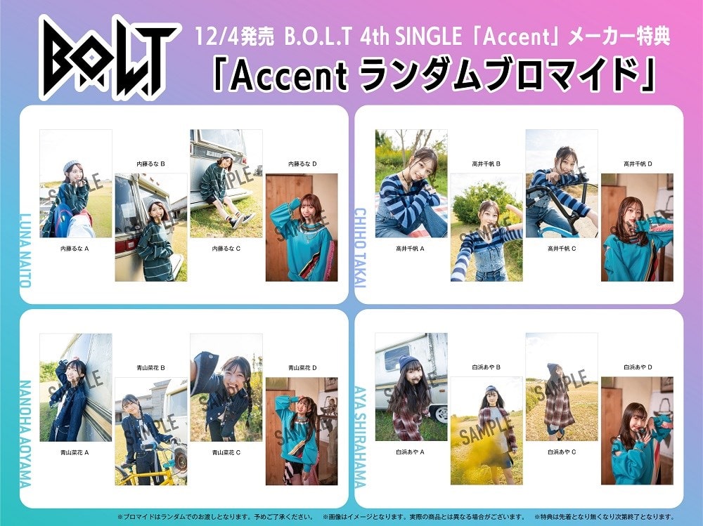 【初回限定盤 収録内容】 [CD] M1. Accent 作詞・作曲:invisible manners(平山大介・福山 整) 編曲:長谷川大介(SUPA LOVE) M2. Make Up 作詞:haruka 作曲・編曲:Hold Out Hope +off vocal ver. [Blu-ray] B.O.L.T 3rd ANNIVERSARY LIVE & Early Summer Tour 2022 FINAL@KANDA SQUARE HALL [PHOTO BOOK] 「B.O.L.T 3rd ANNIVERSARY LIVE & Early Summer Tour 2022 FINAL@KANDA SQUARE HALL」 PHOTO BOOK 【通常盤 収録内容】 [CD] M1. Accent 作詞・作曲:invisible manners(平山大介・福山 整) 編曲:長谷川大介(SUPA LOVE) M2. 風を抱きしめて 作詞・作曲:Misaki 編曲:SpecialThanks +off vocal ver