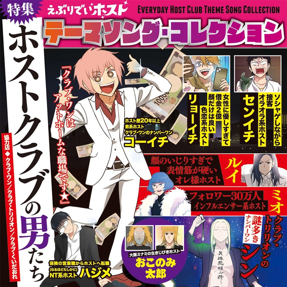 ■収録内容 1.えぶりでいホスト(主題歌OPテーマソング) 作詞・作曲:鬼龍院翔 編曲:鬼龍院翔、tatsuo 歌:えぶホスPlayers コーイチ(CV:下野 紘)&ハジメ(CV:八代 拓)&リョーイチ(CV:畠中 祐)&センイチ(CV:岡本信彦)&シン(CV:西山宏太朗)&ルイ(CV:梅原裕一郎)&ミオ(CV:天﨑滉平)&おこのみ太郎(CV:木内秀信) 2.Top of the Tower 作詞・作曲・編曲:月蝕會議 歌:コーイチ(CV:下野 紘) 3. もう玄界灘 作詞:ごとうにも 作曲・編曲:月蝕會議 歌:ハジメ(CV:八代 拓) 4.夏はテイクアウト 作詞:ごとうにも 作曲・編曲:月蝕會議 歌:リョーイチ(CV:畠中 祐) 5.暴&力 作詞・作曲・編曲:月蝕會議 歌:センイチ(CV:岡本信彦) 6.「Veritas」 作詞・作曲・編曲:月蝕會議 歌:シン(CV:西山宏太朗) 7.アポリア因果世界 作詞・作曲・編曲:月蝕會議 歌:ルイ(CV:梅原裕一郎) 8.Good or Die 作詞・作曲・編曲:月蝕會議 歌:ミオ(CV:天﨑滉平) 9.道頓堀 作詞・作曲・編曲:月蝕會議 歌:おこのみ太郎(CV:木内秀信) ※M2〜M9はTVオンエアサイズでの収録となります。 【イベント概要 】 TVアニメ「えぶりでいホスト」感謝祭 https://everydayhost-event.scissors-blitz.com/ 出演:下野 紘、八代 拓、畠中 祐、岡本信彦、天﨑滉平 、猪股慧士 会場:シアター1010 〒120-0034 東京都足立区千住3-92 千住ミルディスⅠ番館11F 日時:2025年11月29日(土) 13:00~/17:00~ (計2公演) チケット:[通常チケット]8,800円(税込・全席指定) [太客チケット]12,100円(税込・全席指定) ※太客チケット特典:CLUB☆ONEお土産セット(CLUB☆ONEおしぼり風タオル、CLUB☆ONEコースター、リョーイチ・ライター風ストラップ) ◇先行販売チケット◇ [CD(「えぶりでいホスト」テーマソング・コレクション)先行(抽選)] 対象:CD(「えぶりでいホスト」テーマソング・コレクション)をご購入の方 ※お申込み方法は、CD(「えぶりでいホスト」テーマソング・コレクション)に封入の「チケット先行 抽選シリアルコード」用紙をご確認ください。 ・受付期間:2025年8月10日(日)13:00~8月24日(日)23:59 ・当落発表日:2025年8月28日(木)中 ・入金期限:2025年9月1日(月)23:59 企画・製作:えぶりでいホスト製作委員会